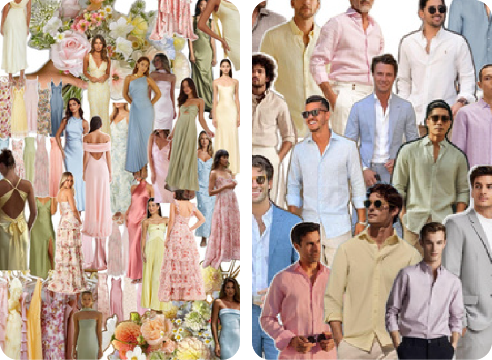 Floral dresses, light button-ups, breezy suits, and shoes made for mingling on the grass.